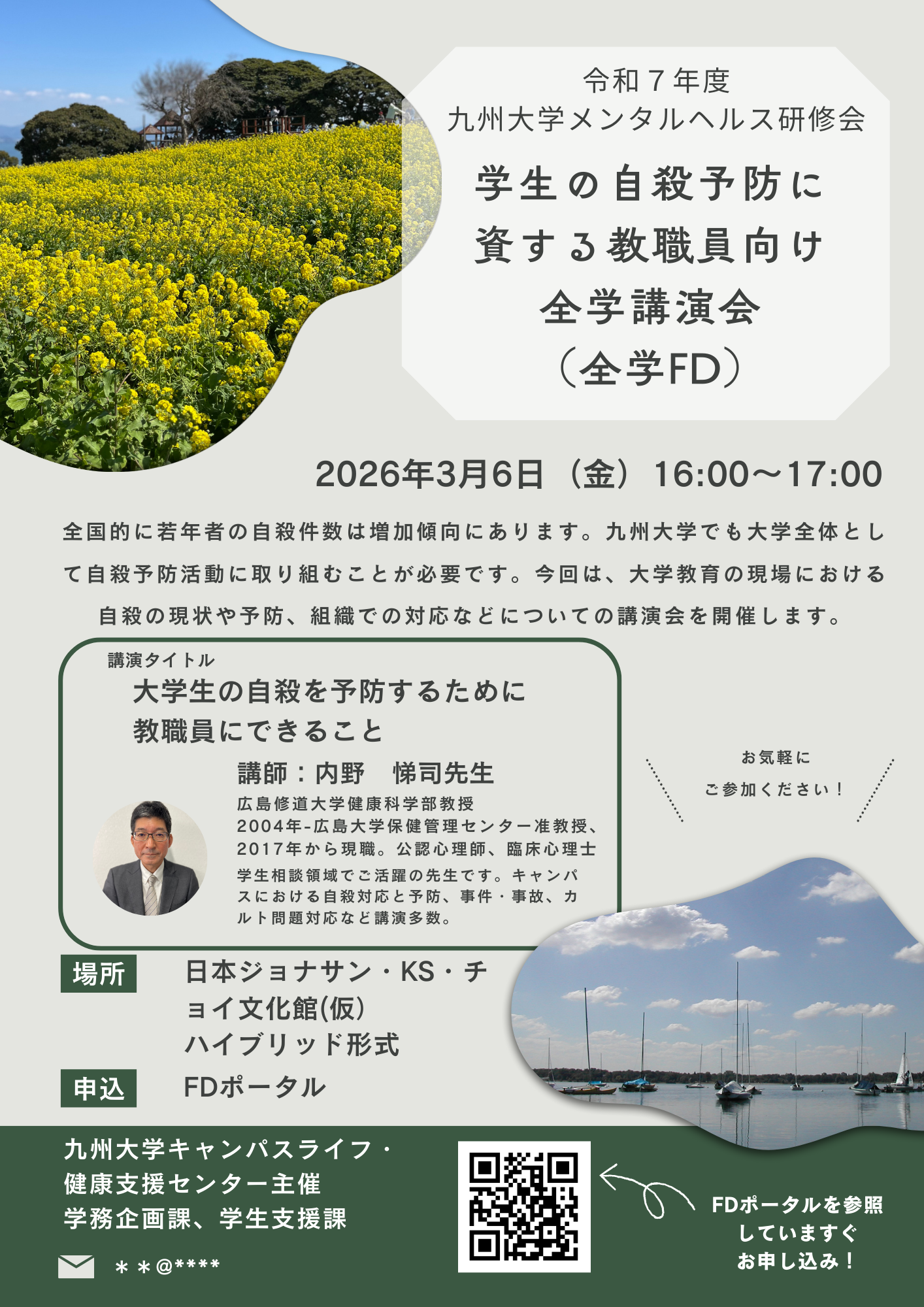 【詳細は添付ファイルをご参照ください】 内野 悌司 先生 (広島修道大学健康科学部教授)を講師としてお招きして、以下のテーマで学生の自殺予防に資する全学講演会を実施いたします。 大学における教育活動と自殺予防―教職員にできること― ※本募集はオンライン形式での参加となります。 対面での参加をご希望の場合は「【全学FD】令和7年度全学FDメンタルヘルス研修会(対面形式)」からご応募ください |